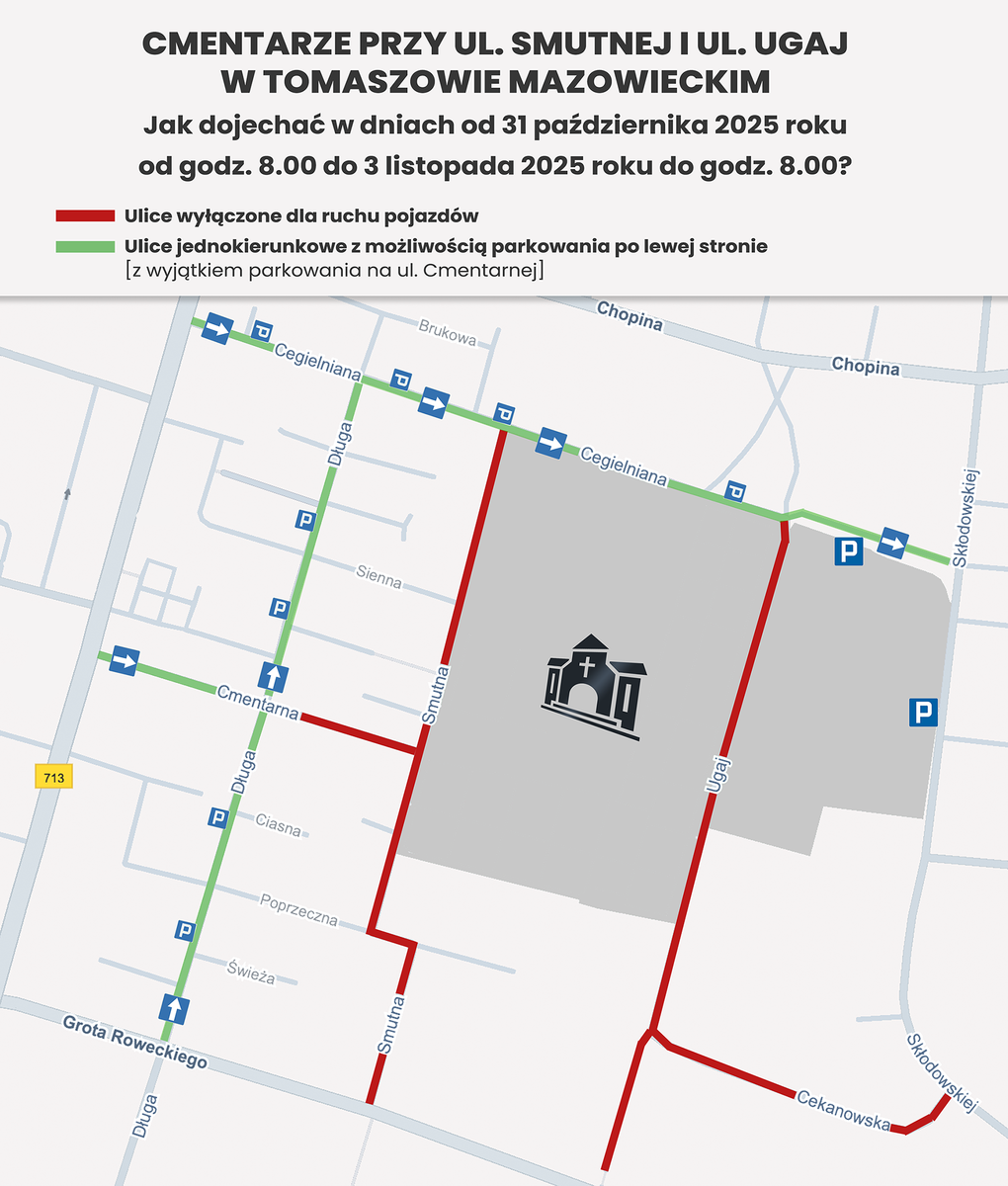 Od 31 października 2025 roku godz. 8.00 do 3 listopada 2025 roku godz. 8.00 w rejonie cmentarzy przy ul. Smutnej, ul. Ugaj i ul. Dąbrowskiej w Tomaszowie Mazowieckim nastąpi zmiana organizacji ruchu.