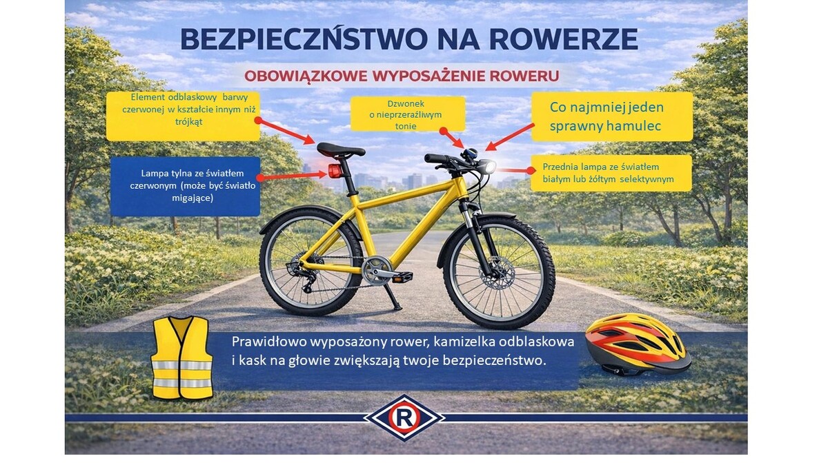 - wyposaż rower w wymagane oświetlenie oraz sprawne hamulce,