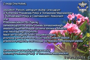 Z okazji Dnia Kobiet, wszystkim Paniom, pełniącym służbę i pracującym w Komendzie Powiatowej Policji w Tomaszowie Mazowieckim i Komisariatach Policji w Czerniewicach i Rokicinach oraz Przedstawicielkom Płci Pięknej, zamieszkującym na terenie powiatu tomaszowskiego, składamy najserdeczniejsze życzenia zdrowia, uśmiechu oraz nieustającego optymizmu...